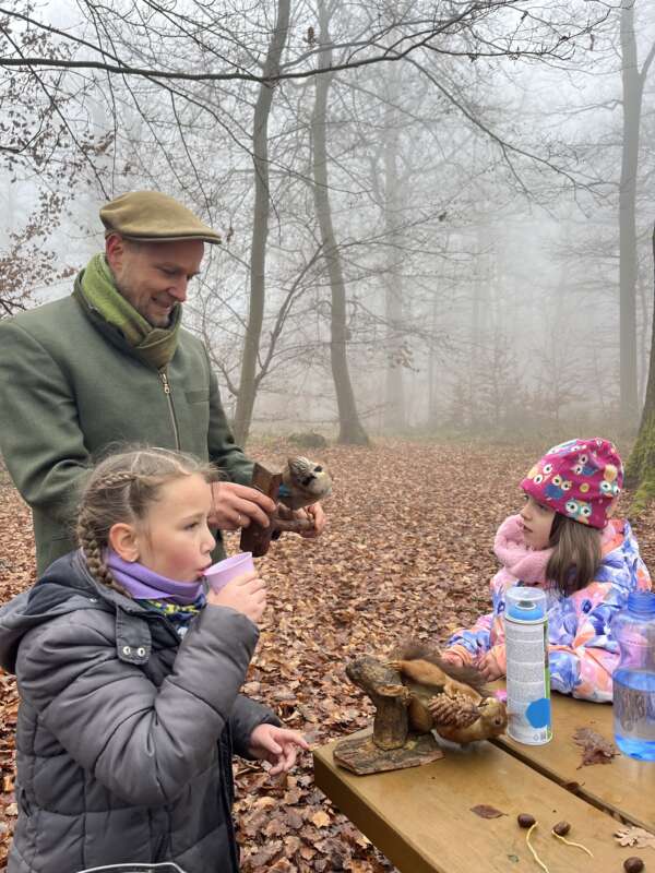 Eine kleine Pause wurde an einem Kletterbaum im Felke Heil- und Aktivwald eingelegt, hier konnten die Kinder frühstücken und klettern. Ganz begeistert waren die Kinder außerdem von den kleinen Helfern des Waldes, die die Förster mitgebracht hatten, einem ausgestopften Eichhörnchen und einem Eichelhäher. Auch die Frage, was die gesprühten Zeichen an den Bäumen bedeuten, wurde Kindern und Lehrerinnen beantwortet.